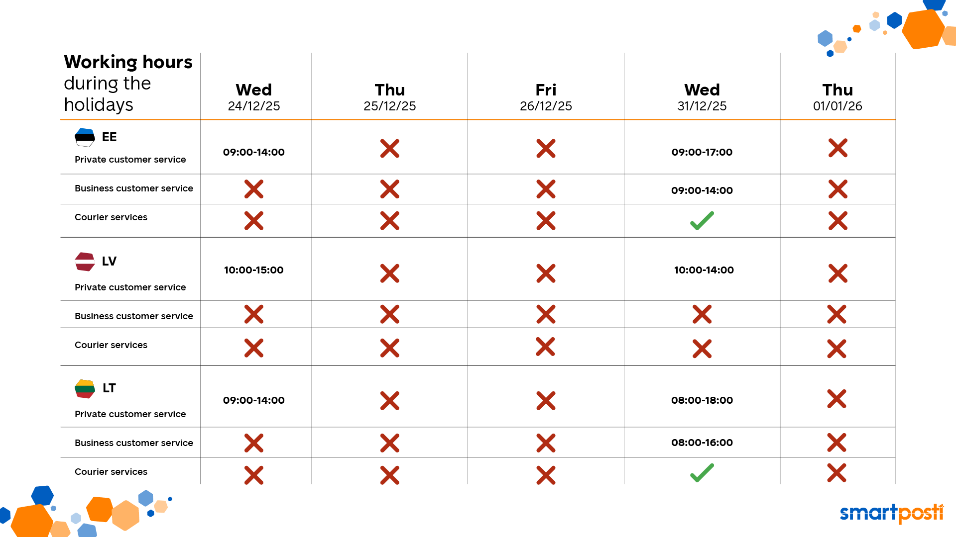 On December 31, parcels will be delivered and collected as usual. Customer service for private clients will operate from 08:00 to 18:00, and for business clients from 08:00 to 16:00.