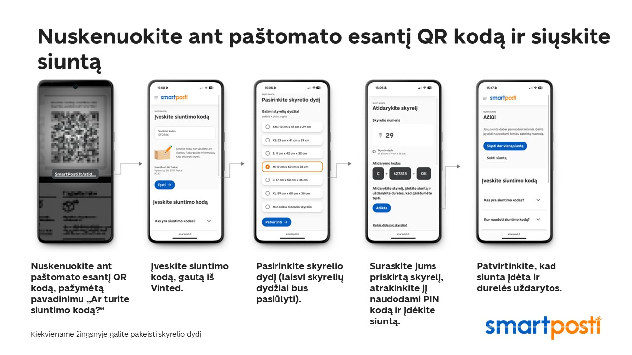 Kartu su partneryste su „Vinted“, „SmartPosti“ pristato naują, dar patogesnį siuntimo būdą iš mūsų paštomatų. Siuntas galėsite siųsti be lipdukų – tereikės siuntimo kodo. Tai leis išsiųsti siuntas dar greičiau ir paprasčiau.